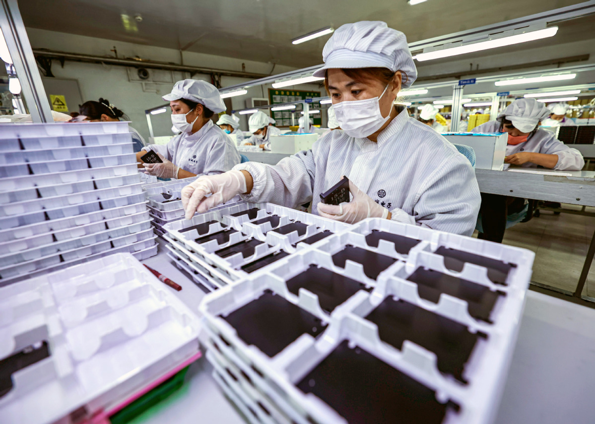 Employees work on the production line of a foreign-funded electronics manufacturing company in Rongcheng, Shandong province. [Photo by LI XINJUN/FOR CHINA DAILY]