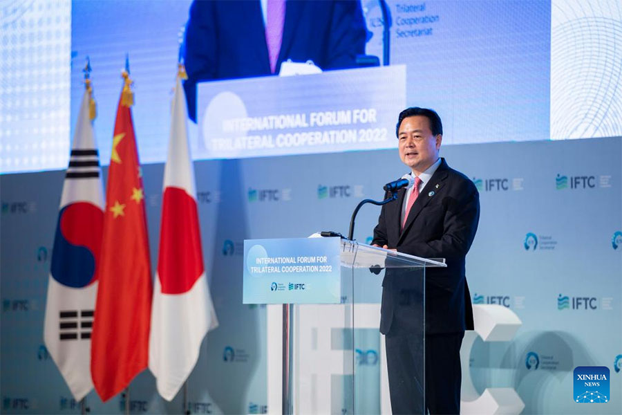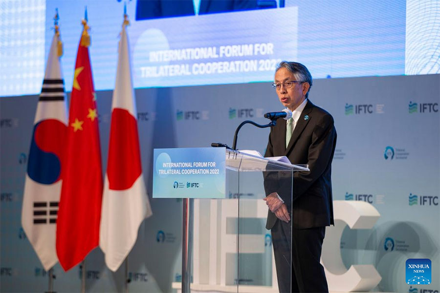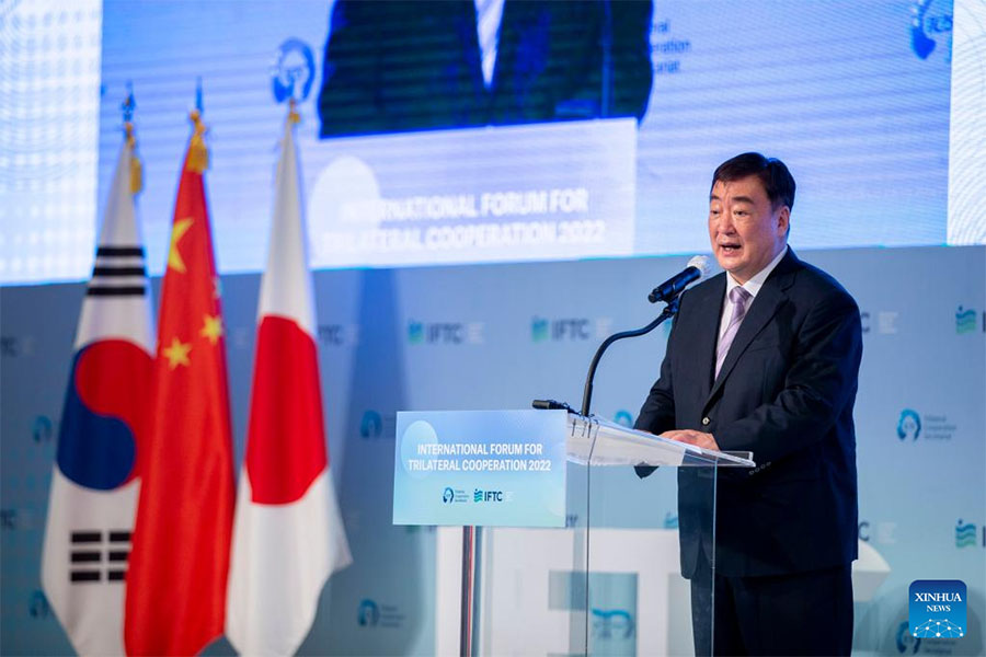 SEOUL, June 14 (Xinhua) -- The International Forum for Trilateral Cooperation 2022 among China, Japan and South Korea was held here on Tuesday under the theme of "Future-Oriented Trilateral Cooperation: Lasting Peace, Common Prosperity, Shared Culture."