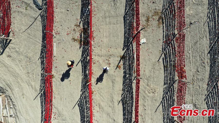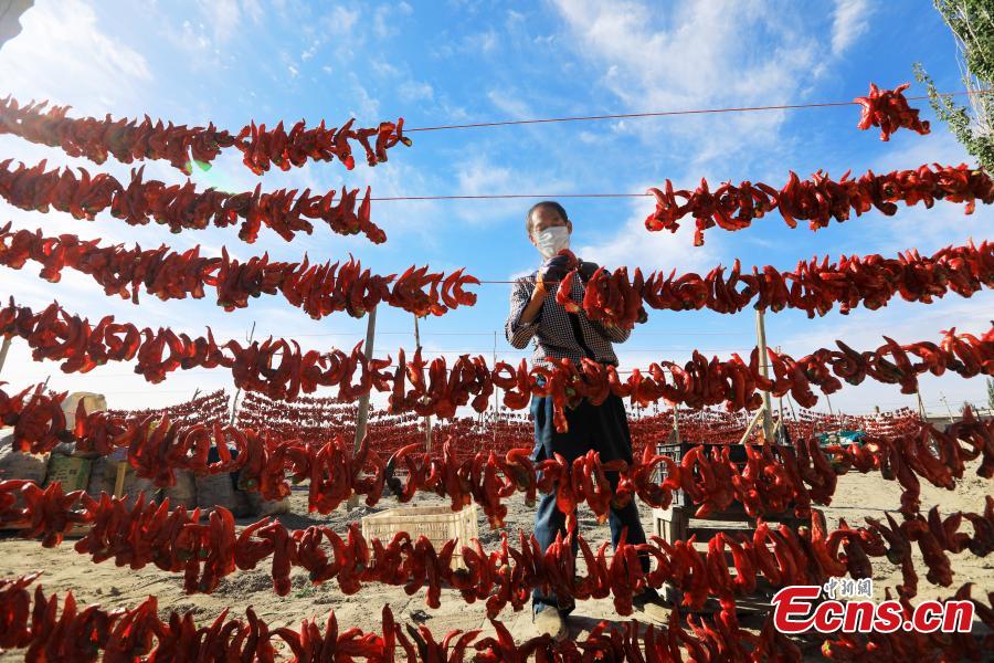 Farmers air chili peppers in the sun in Bohu County, northwest China's Xinjiang Uyghur Autonomous Region, June 14, 2022. (Photo: China News Service/Nian Lei)