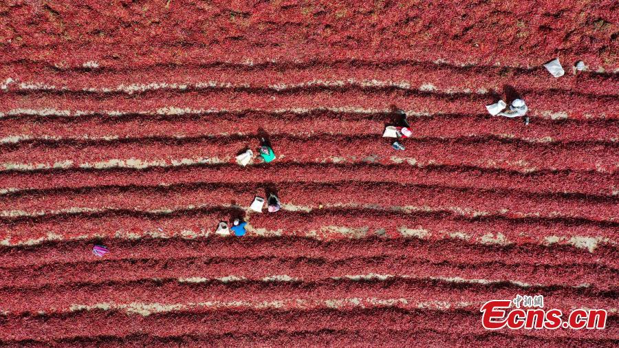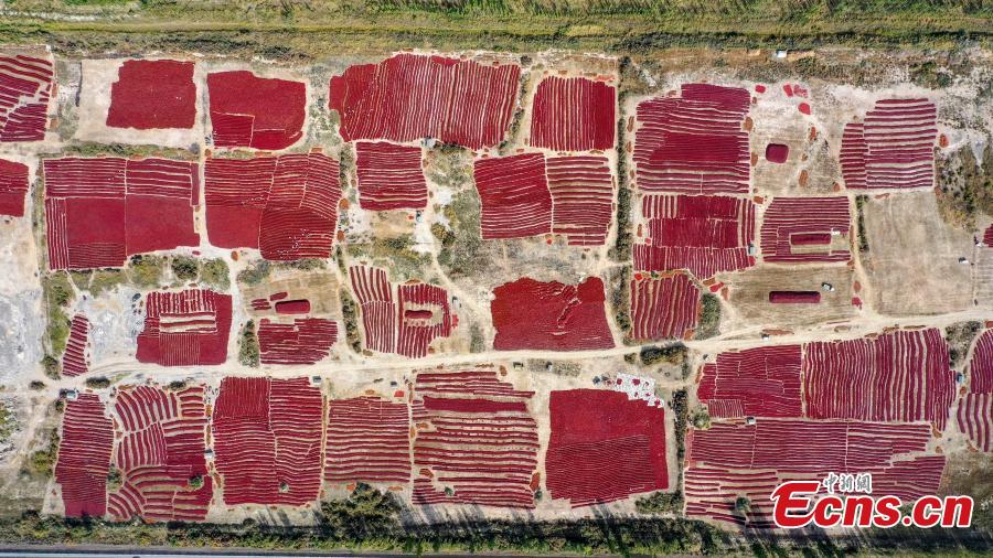 Aerial view of a massive collection of chili peppers dried in the sun in Bohu County, northwest China's Xinjiang Uyghur Autonomous Region, June 14, 2022. (Photo: China News Service/Nian Lei)