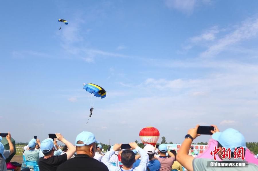 Parachutists perform during the 2022 Jiangxi Aviation Sports Tourism Festival in Ji'an, east China's Jiangxi Province, June 14, 2022. The festival opened on Tuesday in Jiangxi. (Photo: China News Service/Liu Zhankun)