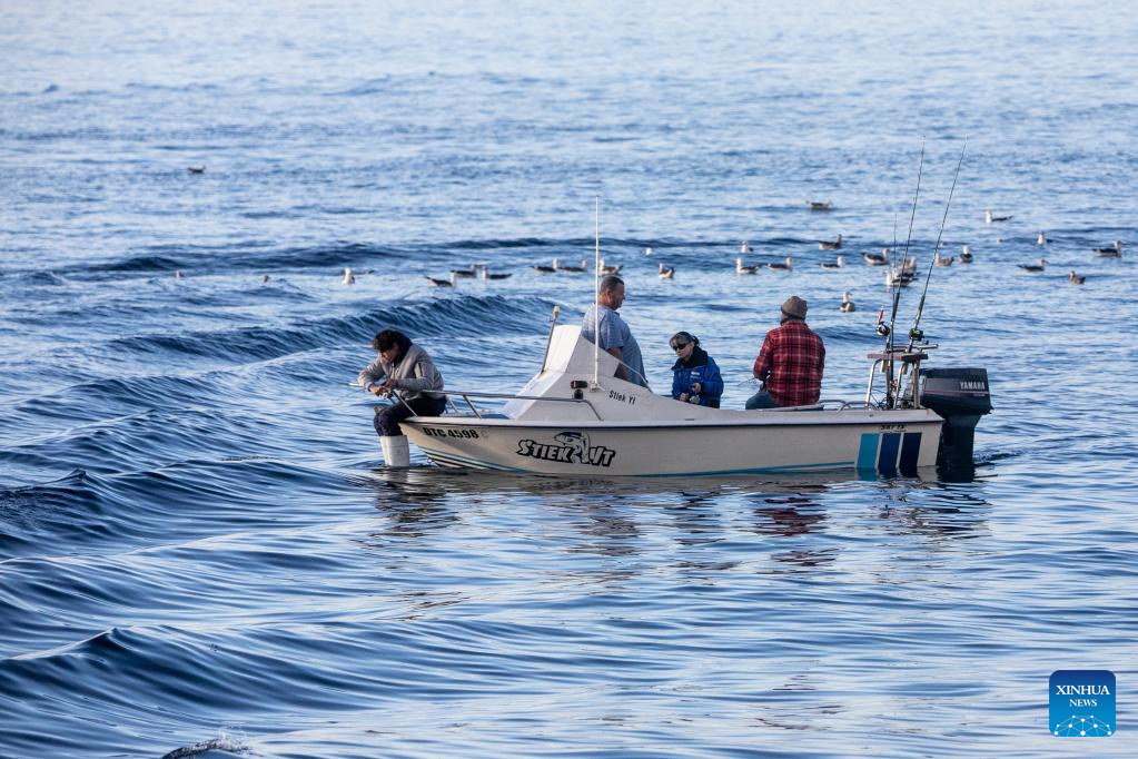People fish on a boat in Simon's Town port, Cape Town, South Africa, on June 15, 2022. (Xinhua/Lyu Tianran)