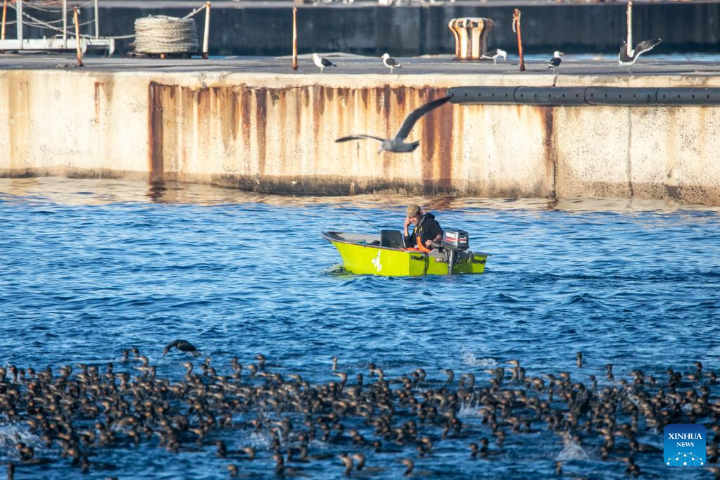 A person fishes on a boat in Simon's Town port, Cape Town, South Africa, on June 15, 2022. (Xinhua/Lyu Tianran)