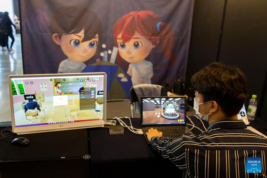 An exhibitor demonstrates virtual reality technology for schools during the Metaverse Expo 2022 held in Seoul, South Korea, June 15, 2022. The expo is held at the Coex Convention &Exhibition Center from June 15 to 17, presenting visitors with metaverse technologies in various scenarios. (Xinhua/Wang Yiliang)