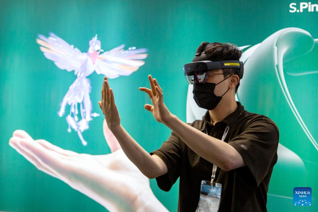 A visitor tries mixed-reality glasses during the Metaverse Expo 2022 held in Seoul, South Korea, June 15, 2022. The expo is held at the Coex Convention &Exhibition Center from June 15 to 17, presenting visitors with metaverse technologies in various scenarios. (Xinhua/Wang Yiliang)