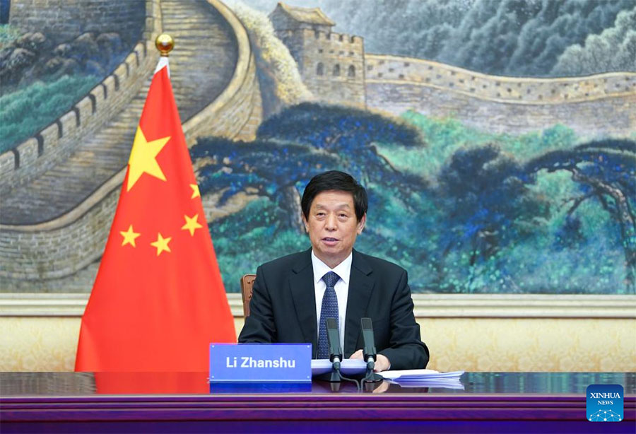 Li Zhanshu, chairman of the National People's Congress (NPC) Standing Committee, holds talks with Manzoor Nadir, speaker of the National Assembly of the Parliament of the Cooperative Republic of Guyana, via video link at the Great Hall of the People in Beijing, capital of China, June 15, 2022. (Xinhua/Zhang Ling)