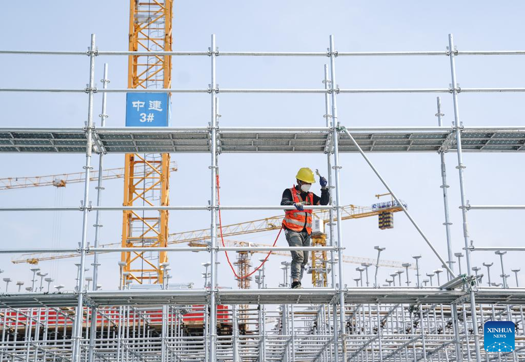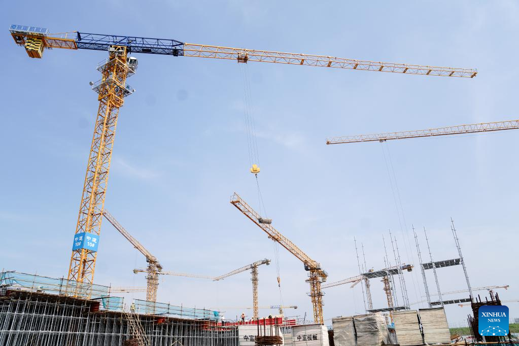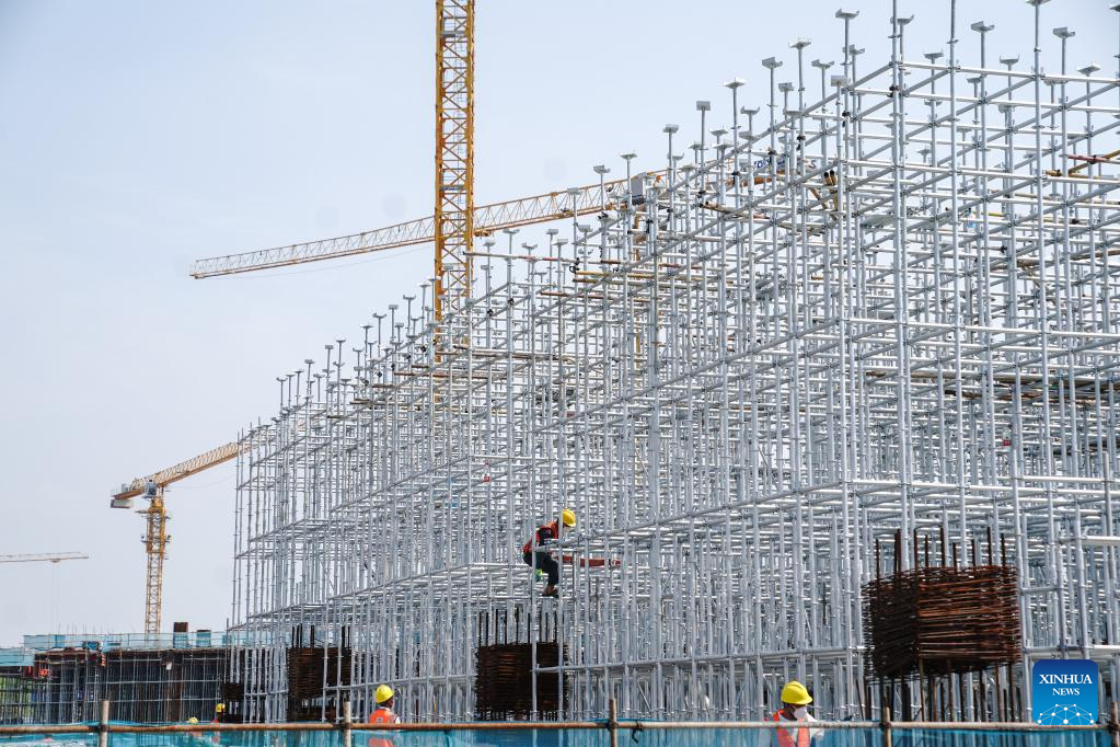 Builders of China Construction Third Engineering Bureau Group Co., Ltd. work at the construction site of Huawei Qingpu research center in Shanghai, east China, June 15, 2022. (Xinhua/Ding Ting)