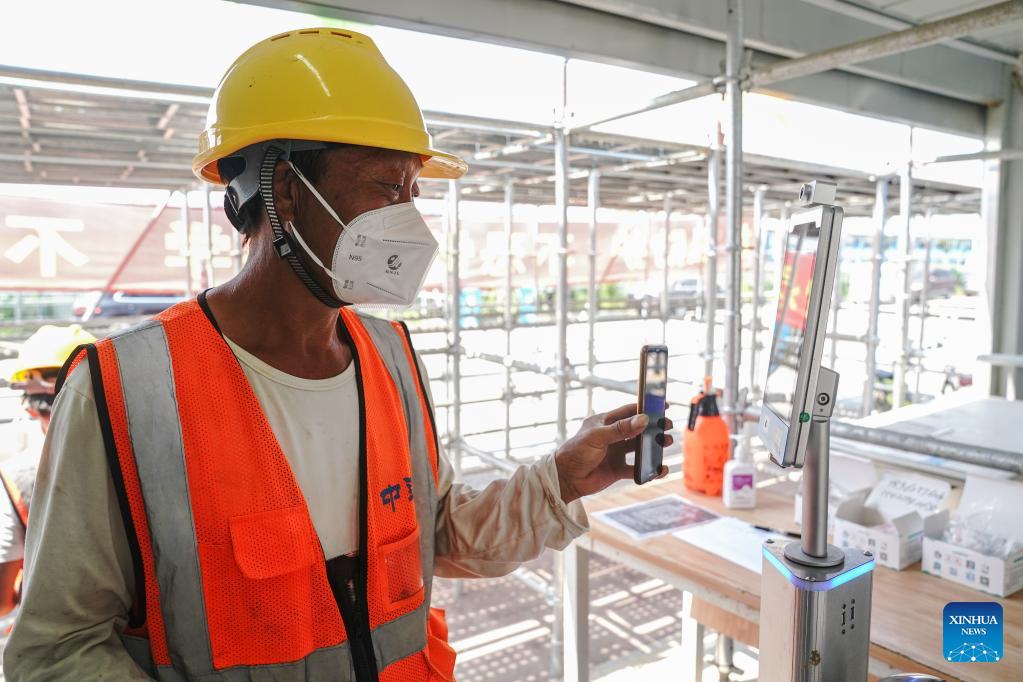 A builder of China Construction Third Engineering Bureau Group Co., Ltd. has his health QR code scanned before entering a construction site in Shanghai, east China. June 15, 2022. (Xinhua/Ding Ting)