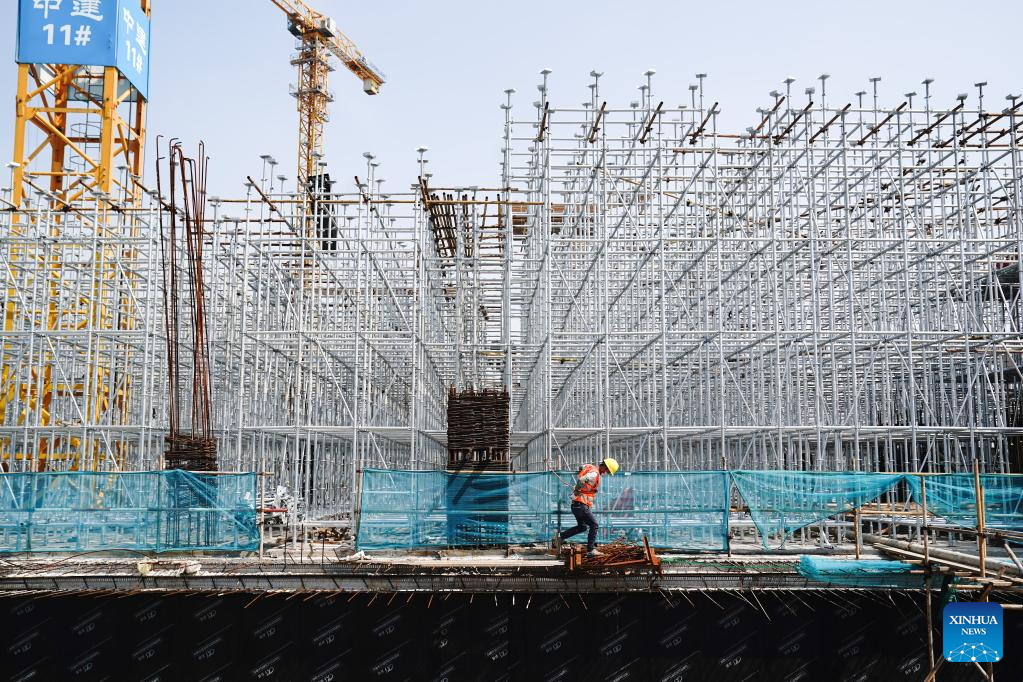 A builder of China Construction Third Engineering Bureau Group Co., Ltd. works at the construction site of Huawei Qingpu research center in Shanghai, east China, June 15, 2022. (Xinhua/Ding Ting)