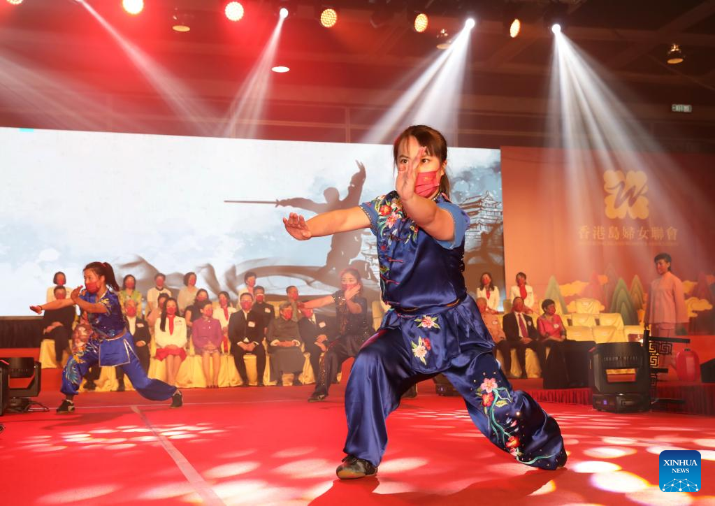 Photo taken on June 15, 2022 shows Chinese Kung Fu (Chinese martial arts) performance during an event under the theme of traditional Chinese culture in Hong Kong, south China. The event is held by Hong Kong Island Women's Association on Wednesday as part of celebrations for the 25th anniversary of Hong Kong's return to the motherland. (Xinhua/Wu Xiaochu)
