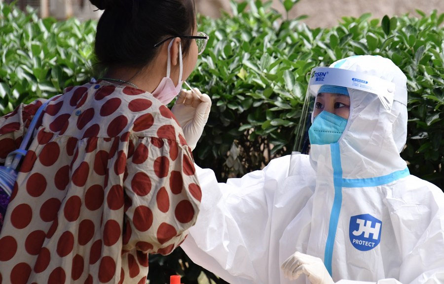 A medical worker takes a swab sample from a resident for nucleic acid testing at Balizhuang Subdistrict in Chaoyang District, Beijing, capital of China, June 11, 2022. (Xinhua/Li Xin)