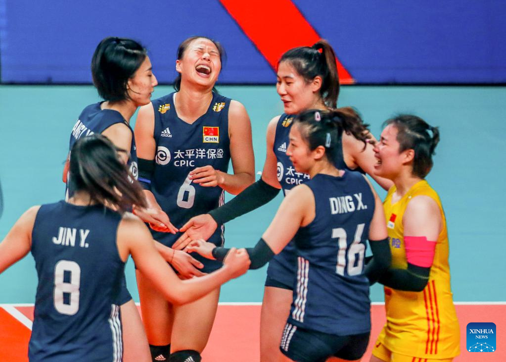 Players of China celebrate scoring during the FIVB Volleyball Nations League Women's Pool 4 match against Belgium in Quezon City, the Philippines on June 15, 2022. (Xinhua/Rouelle Umali)