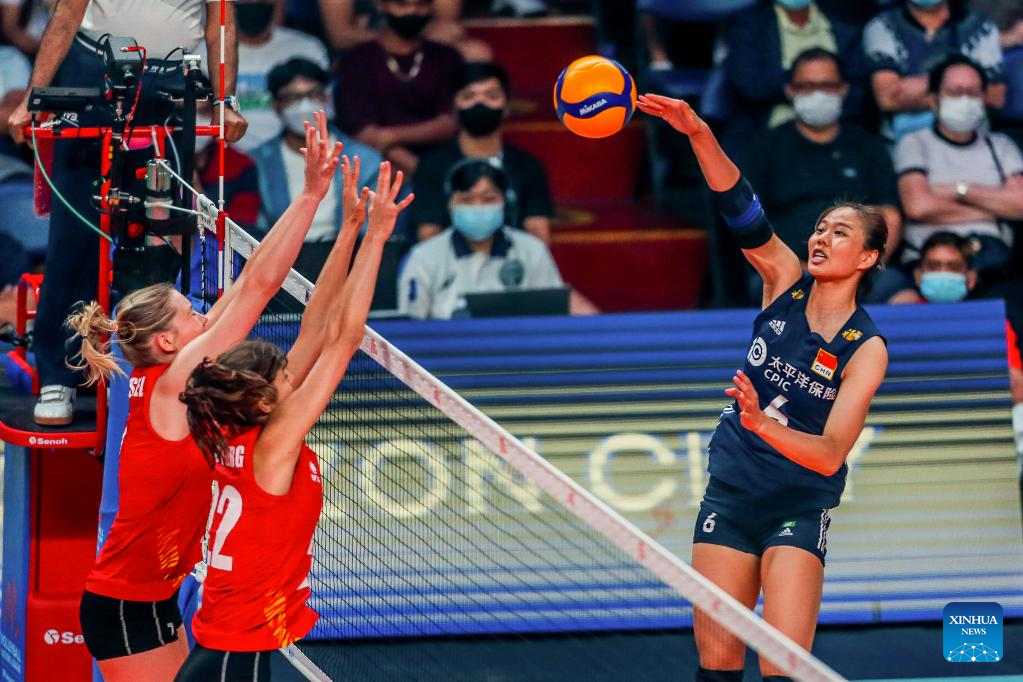 Gong Xiangyu (R) of China spikes the ball during the FIVB Volleyball Nations League Women's Pool 4 match against Belgium in Quezon City, the Philippines on June 15, 2022. (Xinhua/Rouelle Umali)