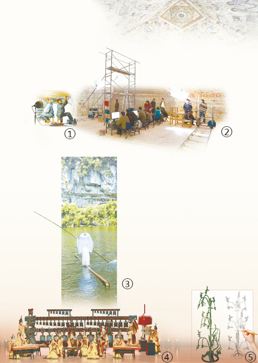 ①② Team members from the Dunhuang Academy repair murals and collect digital data at a cave inside the Mogao Grottoes in Dunhuang city, northwest China’s Gansu Province. (Photo courtesy of Dunhuang Academy)