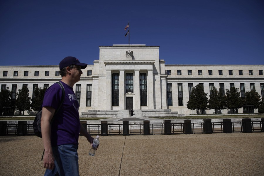 A man walks past the US Federal Reserve in Washington, DC, on March 16, 2022. [Photo/Xinhua]