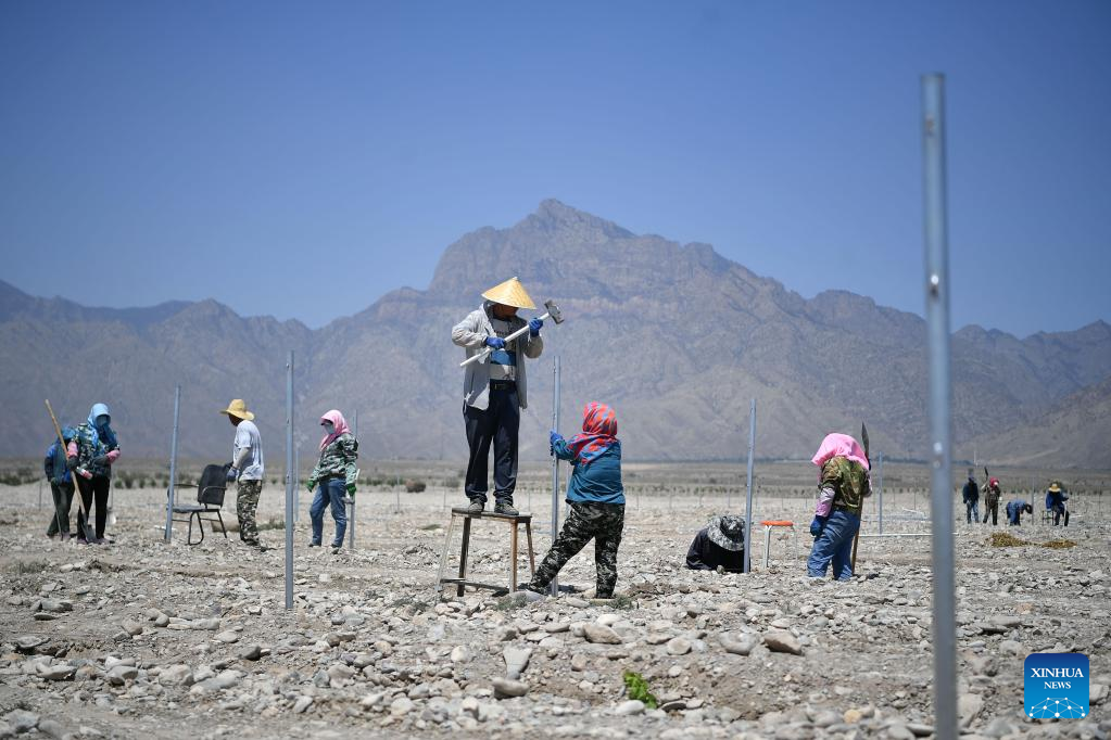 Workers put up grape trellis on the construction site of the Turandot Winery Town project in Yinchuan, northwest China's Ningxia Hui Autonomous Region, June 14, 2022.