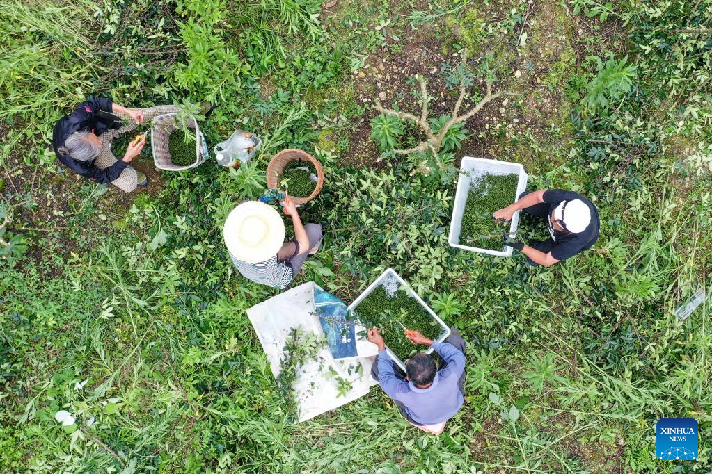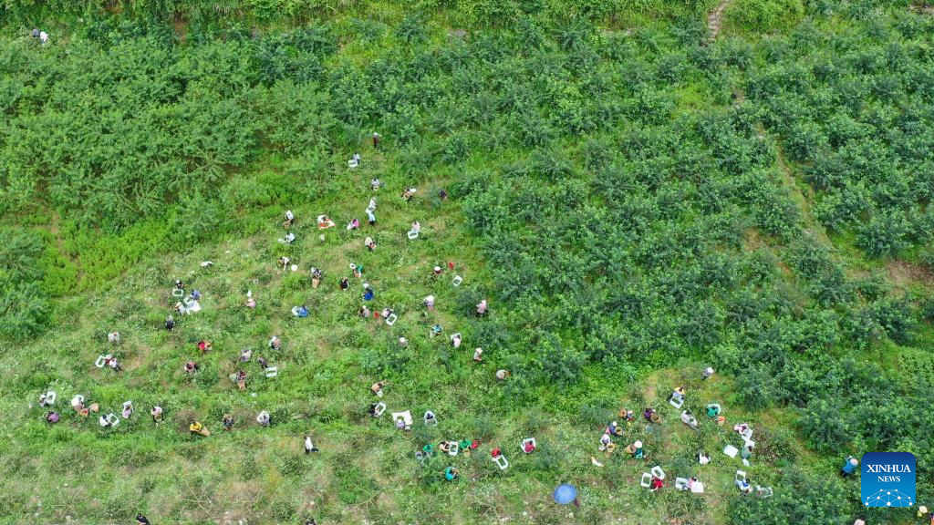 In this aerial photo, villagers harvest Sichuan pepper in Zhennan Town of Wuchuan Gelao and Miao Autonomous County, southwest China's Guizhou Province, June 16, 2022.