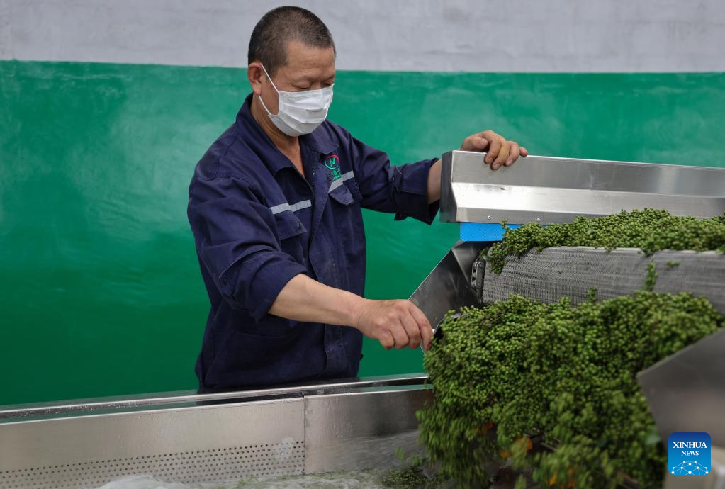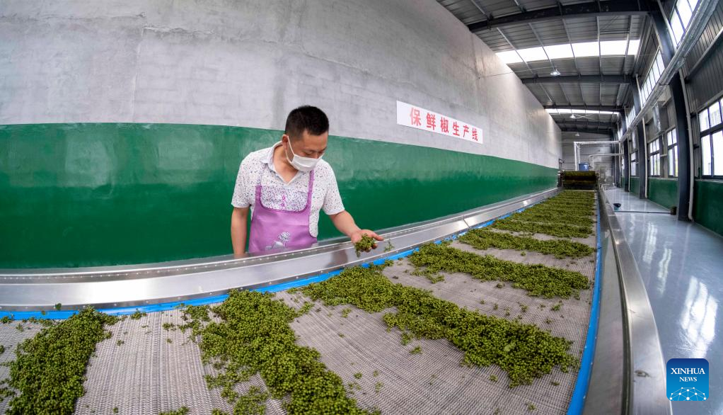 A staff member processes Sichuan pepper at the production line of a local company in Zhennan Town of Wuchuan Gelao and Miao Autonomous County, southwest China's Guizhou Province, June 15, 2022.
