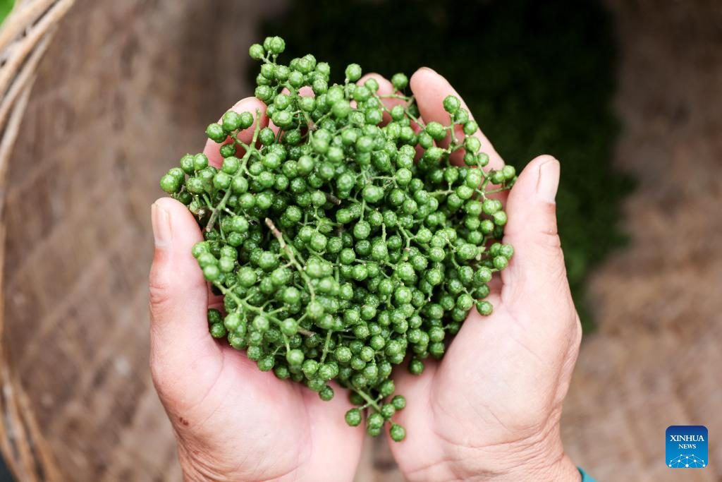 A villager demonstrates freshly-picked Sichuan pepper in Zhennan Town of Wuchuan Gelao and Miao Autonomous County, southwest China's Guizhou Province, June 16, 2022.