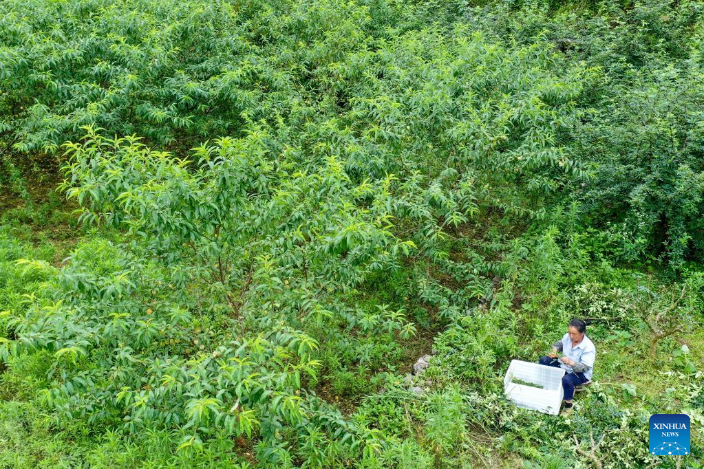 In this aerial photo, a villager harvests Sichuan pepper in Zhennan Town of Wuchuan Gelao and Miao Autonomous County, southwest China's Guizhou Province, June 16, 2022.