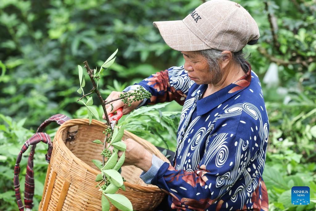 A villager harvests Sichuan pepper in Zhennan Town of Wuchuan Gelao and Miao Autonomous County, southwest China's Guizhou Province, June 16, 2022.