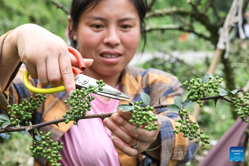 Local authorities have been committed to planting Sichuan pepper, a cash crop highly adaptable to areas of rocky desertification, as a way to boost local economy and drive rural revitalization. The total area of Sichuan pepper plantation now stands at 225,000 mu (about 15,000 hectares) in the county. (Photo by Chen Qingjun/Xinhua)