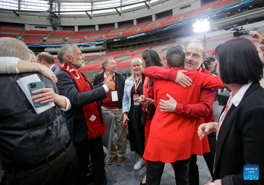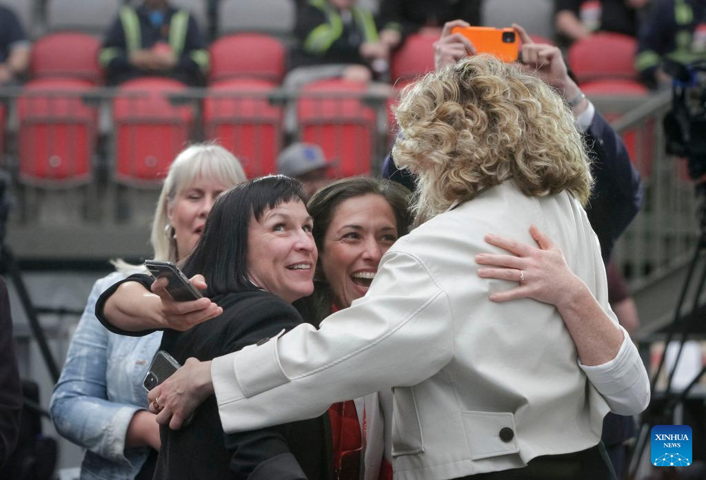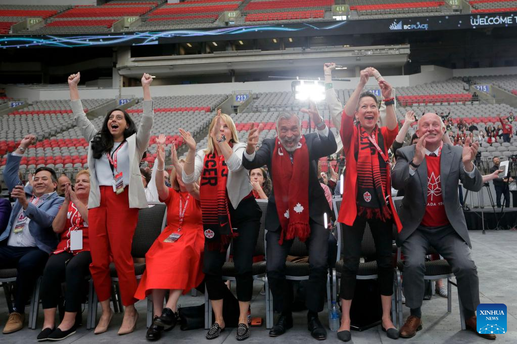Event guests celebrate after Vancouver was chosen as one of the host cities for the 2026 FIFA World Cup during the host city selection watch party at BC Place Stadium in Vancouver, British Columbia, Canada, on June 16, 2022. (Photo by Liang Sen/Xinhua)