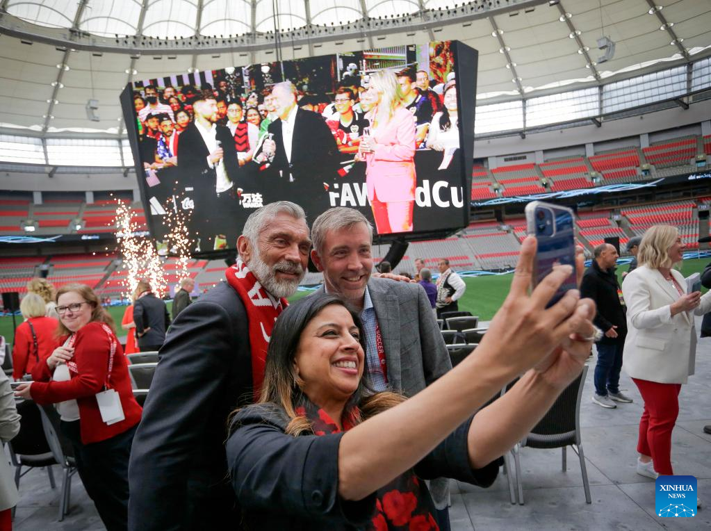 Event guests take selfie after Vancouver was chosen as one of the host cities for the 2026 FIFA World Cup during the host city selection watch party at BC Place Stadium in Vancouver, British Columbia, Canada, on June 16, 2022. (Photo by Liang Sen/Xinhua)