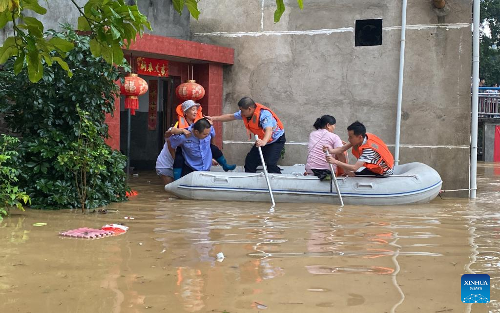 Photo taken with a mobile phone on June 13, 2022 shows rescuers evacuating stranded people in flood water in Quannan County, east China's Jiangxi Province. (Xinhua)