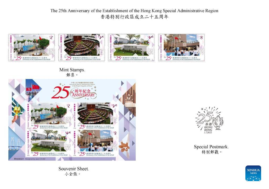 Picture shows the mint stamps, souvenir sheet and the special postmark of the commemorative stamps on "The 25th Anniversary of the Establishment of the Hong Kong Special Administrative Region". Hongkong Post will issue commemorative stamps on "The 25th Anniversary of the Establishment of the Hong Kong Special Administrative Region" and "The 25th Anniversary of the Stationing of the Chinese People's Liberation Army in Hong Kong" on July 1. (Xinhua)