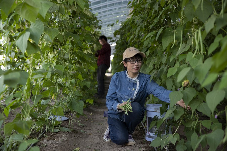 Workers pick green beans in a plastic greenhouse in the Baijitan national ecological reserve of Lingwu, northwest China's Ningxia Hui Autonomous Region, June 14, 2022. (Xinhua/Yang Zhisen)
