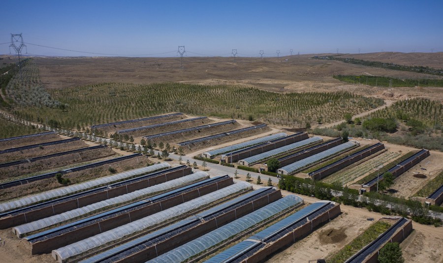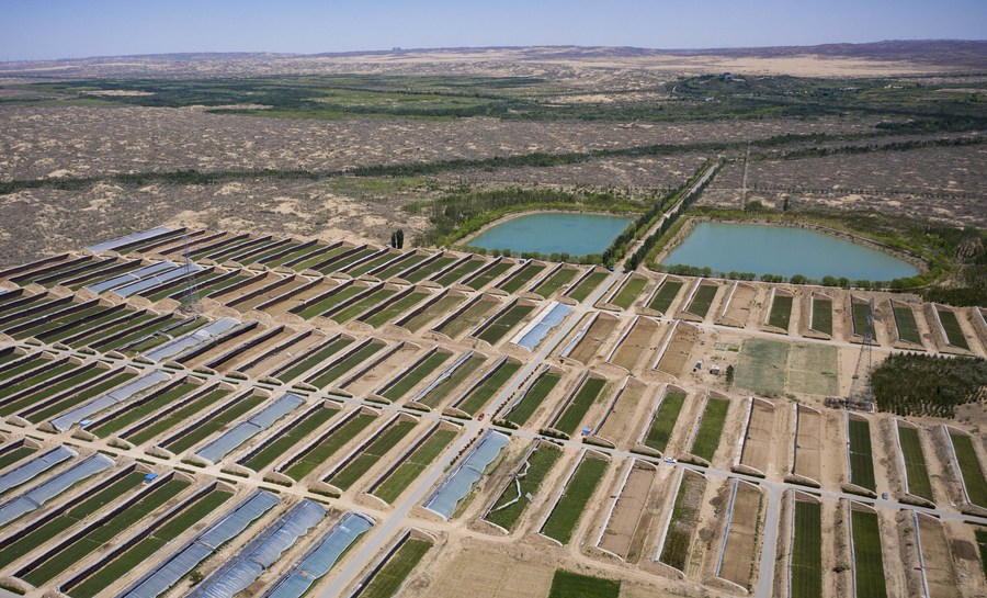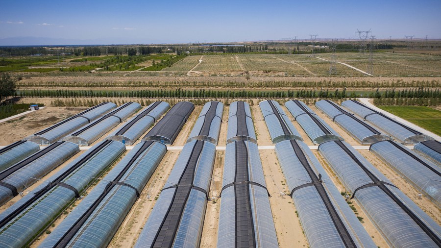 Aerial photo taken on June 14, 2022 shows plastic greenhouses in the Baijitan national ecological reserve of Lingwu, northwest China's Ningxia Hui Autonomous Region. (Xinhua/Yang Zhisen)
