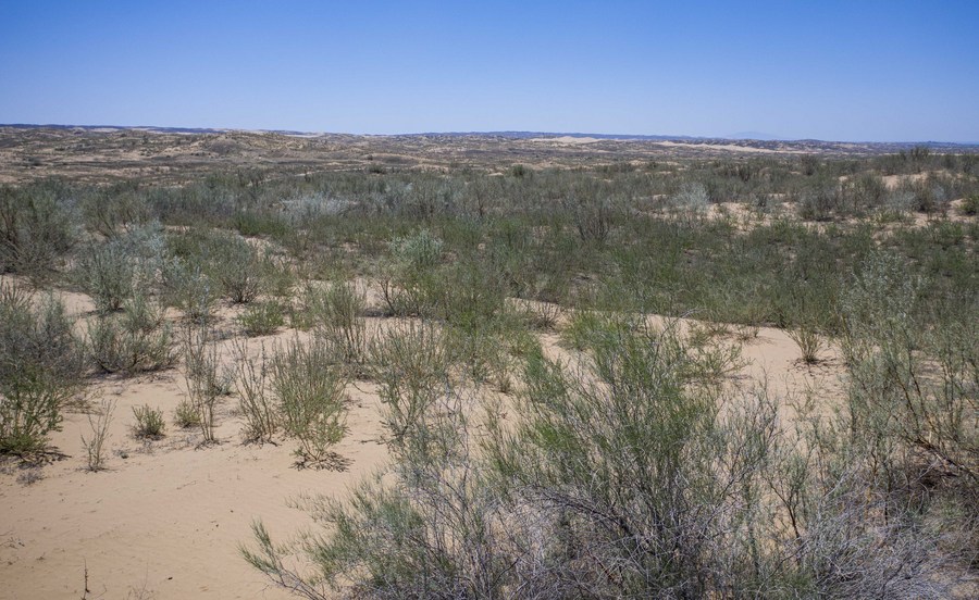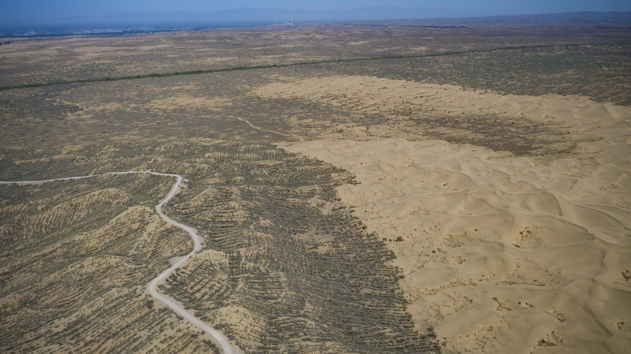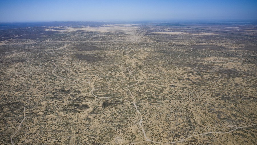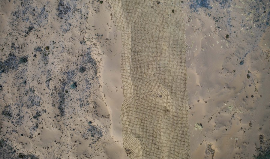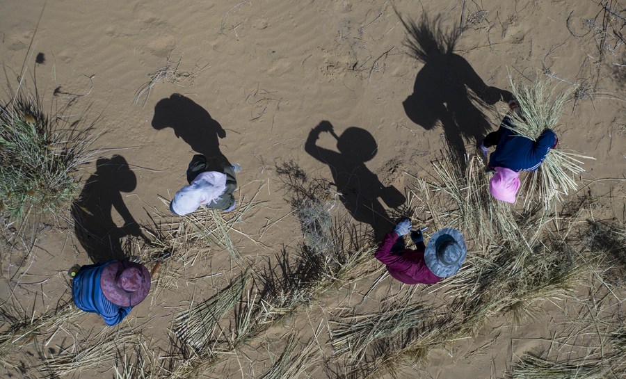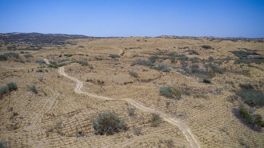In this aerial photo, sand control workers make straw checkerboard barriers in the Baijitan national ecological reserve of Lingwu, northwest China's Ningxia Hui Autonomous Region, June 16, 2022. (Xinhua/Yang Zhisen)