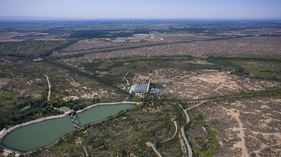 Aerial photo taken on June 14, 2022 shows a view of Baijitan national ecological reserve of Lingwu, northwest China's Ningxia Hui Autonomous Region. (Xinhua/Yang Zhisen)