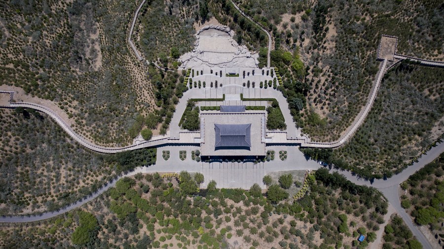Aerial photo taken on June 15, 2022 shows a view of an exhibition hall showcasing China's sand control efforts in the Baijitan national ecological reserve of Lingwu, northwest China's Ningxia Hui Autonomous Region. (Xinhua/Yang Zhisen)