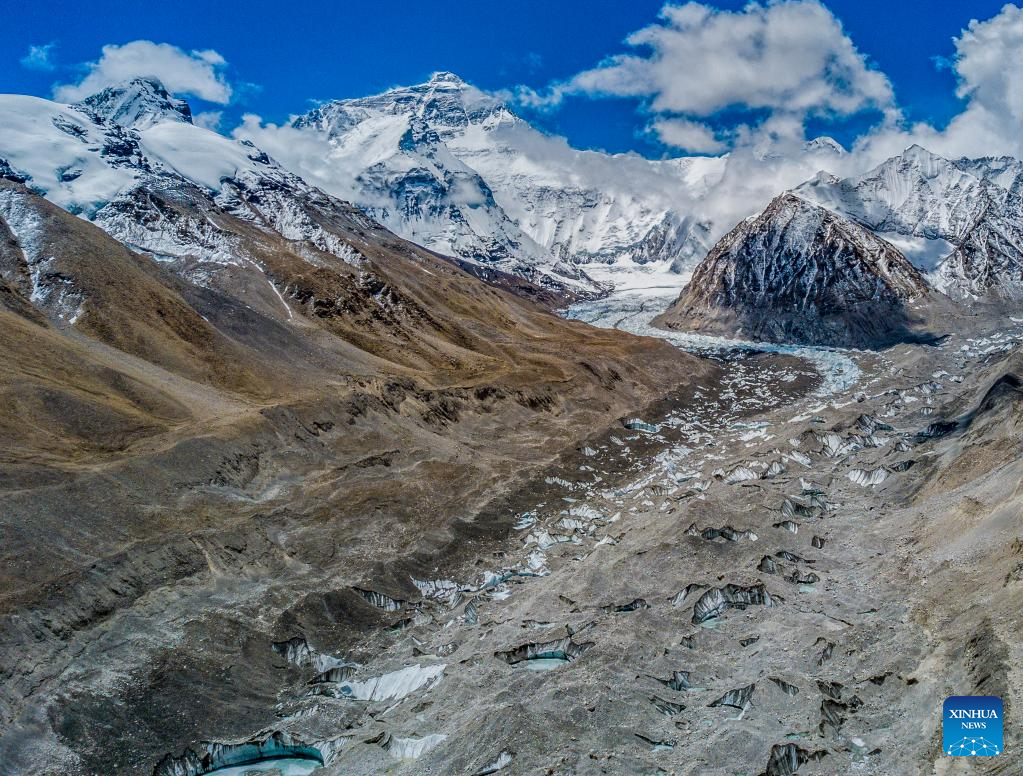 Aerial photo taken on May 8, 2022 in Xigaze shows the Rongbuk glacier at the foot of Mount Qomolangma, southwest China's Tibet Autonomous Region. (Xinhua/Tian Jinwen)