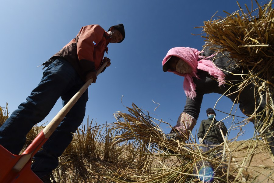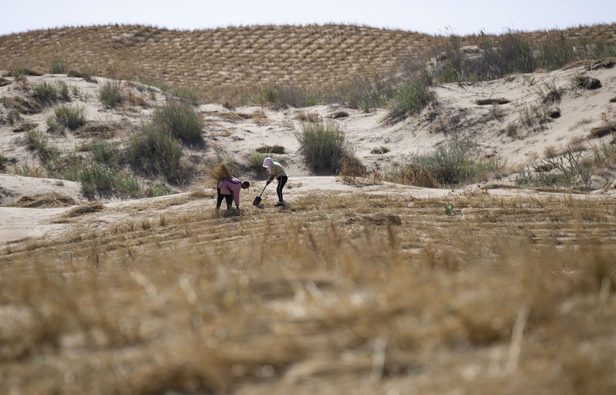 Sand control workers make straw checkerboard barriers in the Baijitan national ecological reserve of Lingwu on the southwest edge of Maowusu Desert, northwest China's Ningxia Hui Autonomous Region, June 16, 2022. (Xinhua/Yang Zhisen)