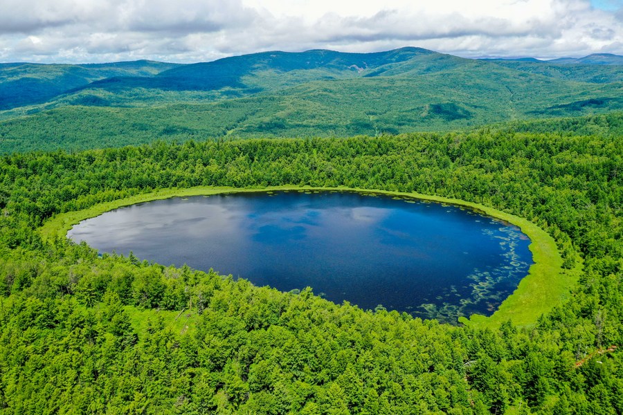 Aerial photo taken on July 14, 2021 shows the Arxan Tianchi (Heavenly Lake) in the Arxan National Forest Park, north China's Inner Mongolia Autonomous Region. (Xinhua/Lian Zhen)