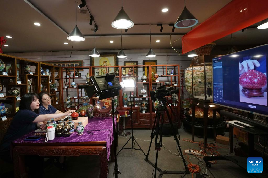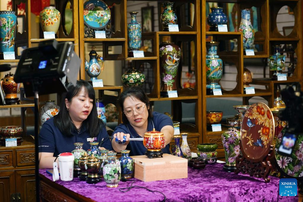 Staff members promote cloisonne craftwork through livestreaming at Beijing Enamel Factory Co., Ltd. in Beijing, capital of China, June 18, 2022. Beijing recently launched a livestreaming promotion campaign to expand e-commerce business. (Xinhua/Ju Huanzong)