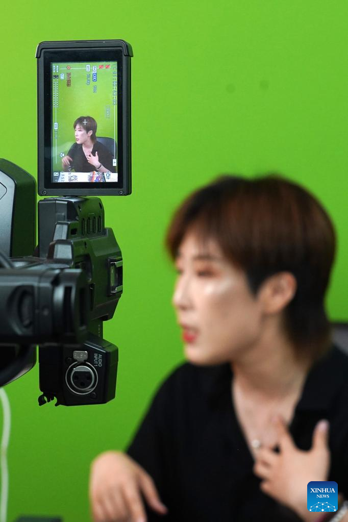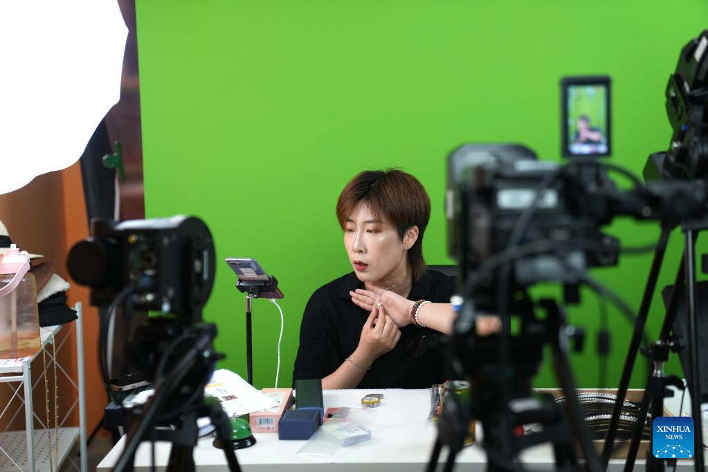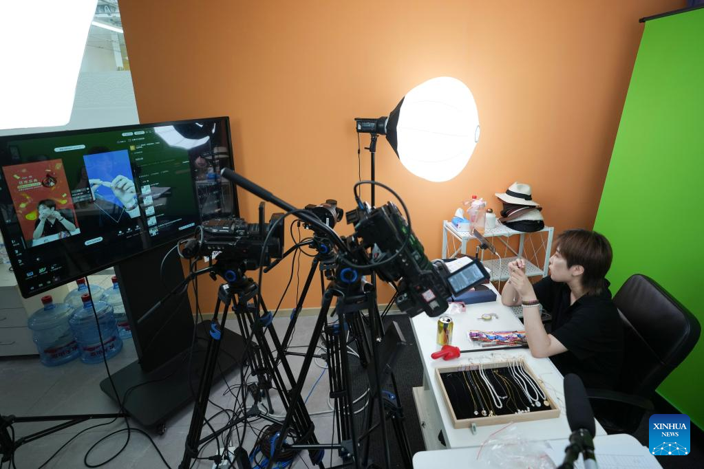 A staff member promotes pearl jewelry through livestreaming at Hongqiao Pearl Market in Dongcheng District of Beijing, capital of China, June 18, 2022. Beijing recently launched a livestreaming promotion campaign to expand e-commerce business. (Xinhua/Ju Huanzong)