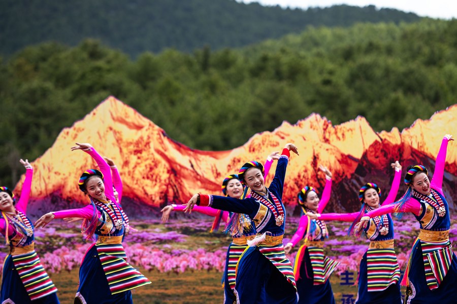 Actresses perform traditional dance at a horse racing festival held in Shangri-La, Deqen Tibetan Autonomous Prefecture, southwest China's Yunnan Province, June 3, 2022. (Xinhua/Cao Mengyao)