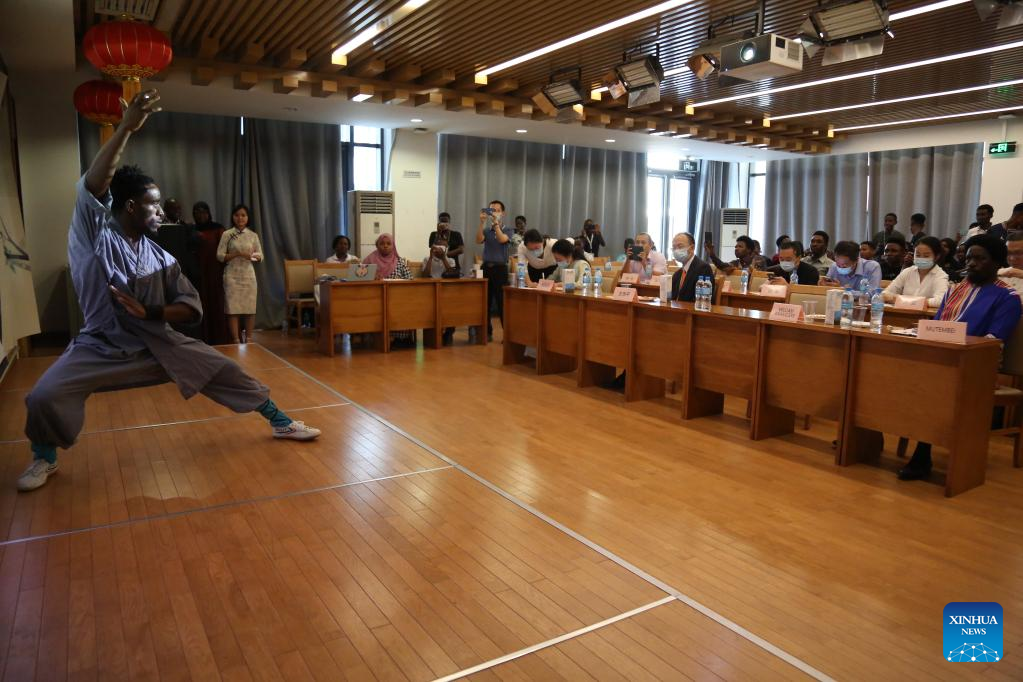 A Tanzanian student performs Chinese martial arts during the 21st Chinese Bridge Chinese Proficiency Competition 2022 at the Confucius Institute of the University of Dar es Salaam in Dar es Salaam, Tanzania on June 17, 2022. (Photo by Herman Emmanuel/Xinhua)