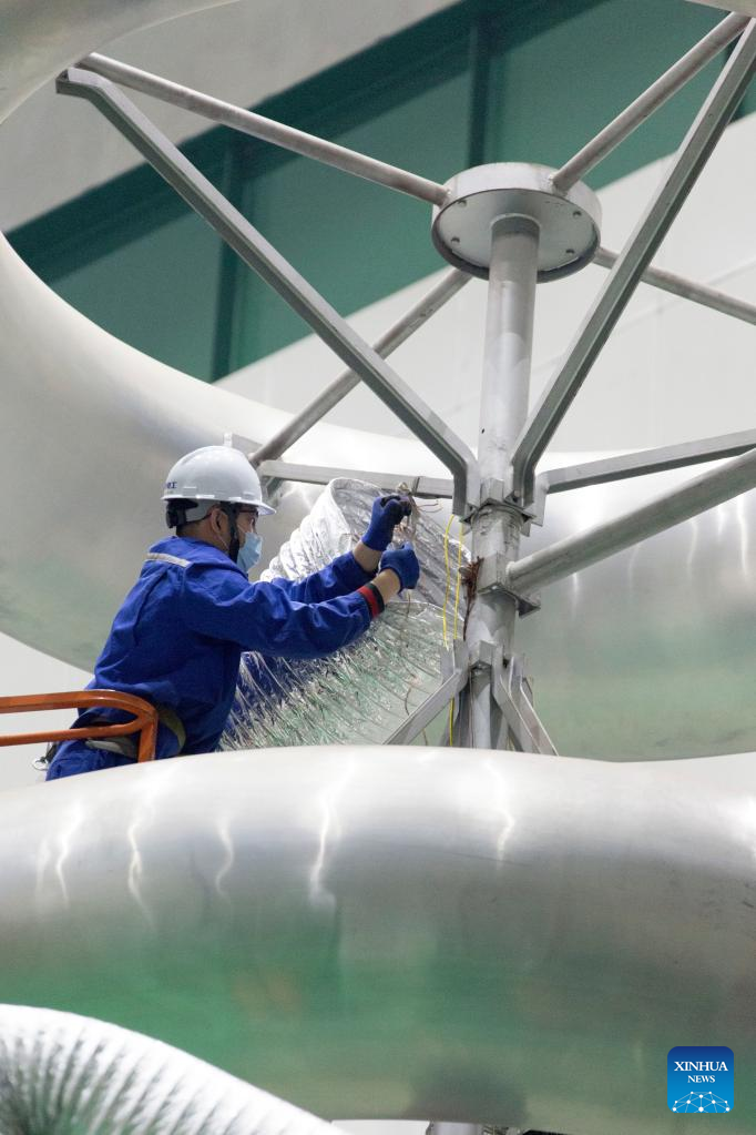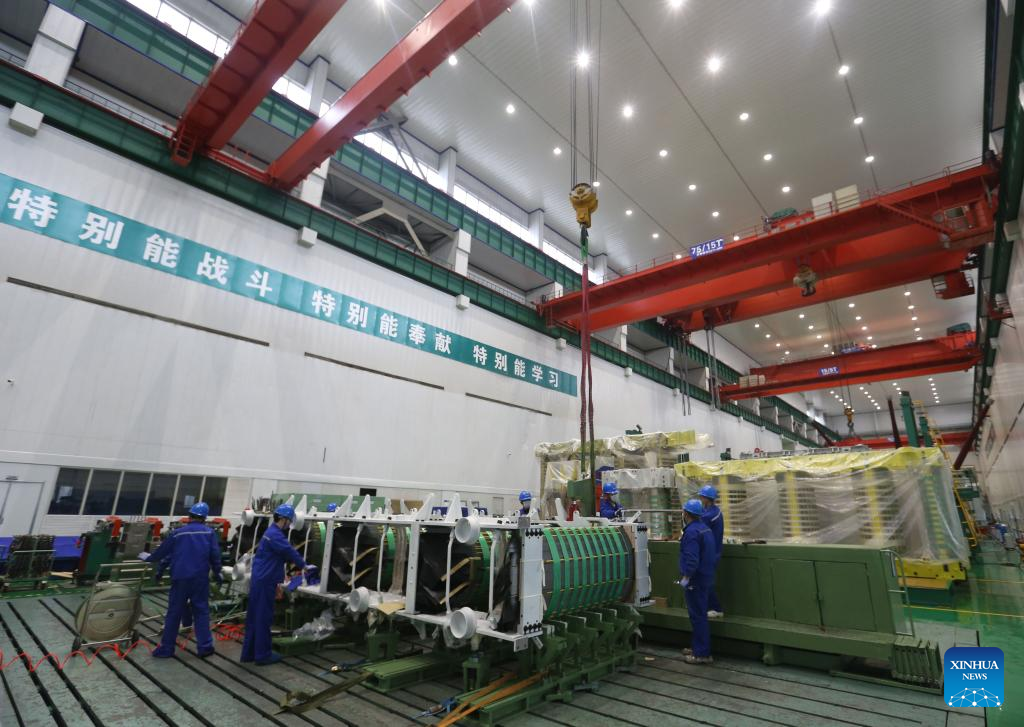 Staff members of TBEA Co., Ltd. make products for the ultrahigh voltage direct current power transmission (UHVDC) projects in Shenyang, northeast China's Liaoning Province, March 27, 2022.
