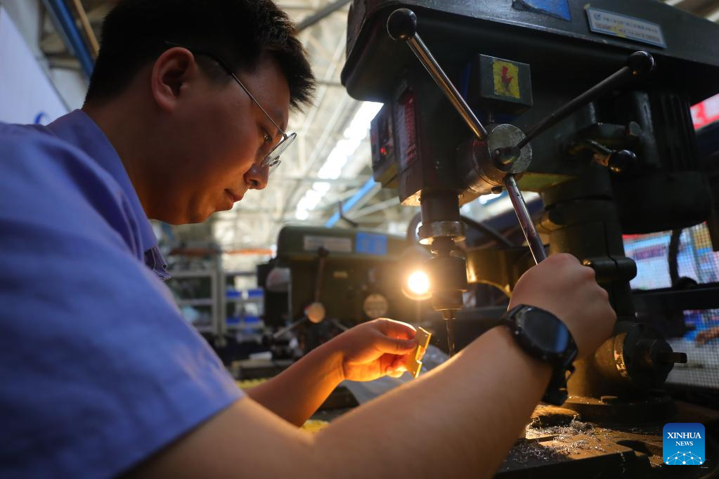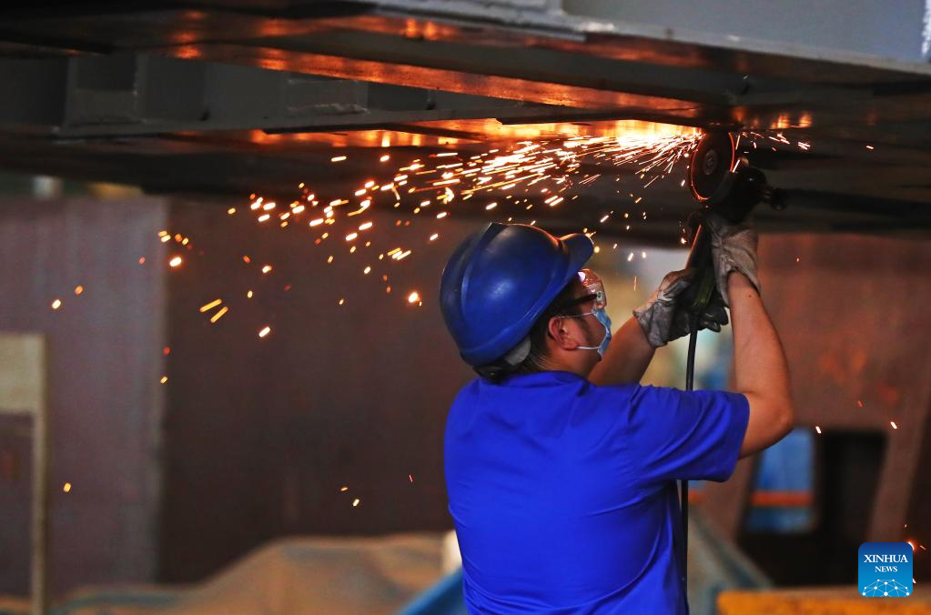 A staff member of Shenyang Blower Works Group Corporation (SBW) grinds a compressor housing at a workshop in Shenyang, northeast China's Liaoning Province, June 13, 2022.