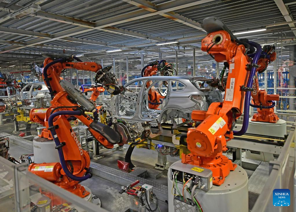 Robots carry out welding work in the car assembly line at BMW Brilliance Plant Tiexi in Shenyang, northeast China's Liaoning Province, Feb. 16, 2022.