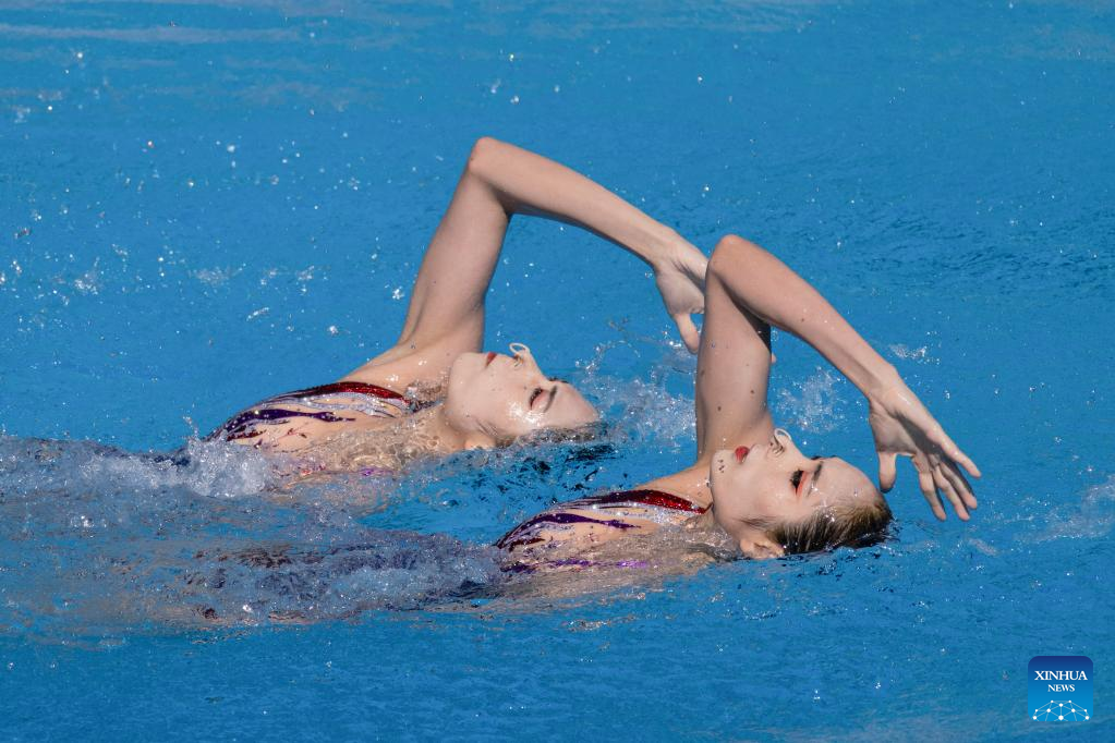 Wang Liuyi and Wang Qianyi of China perform during the Artistic Swimming Women Duet Technical Final at the 19th FINA World Championships in Budapest, Hungary on June 19, 2022. (Photo by Attila Volgyi/Xinhua)