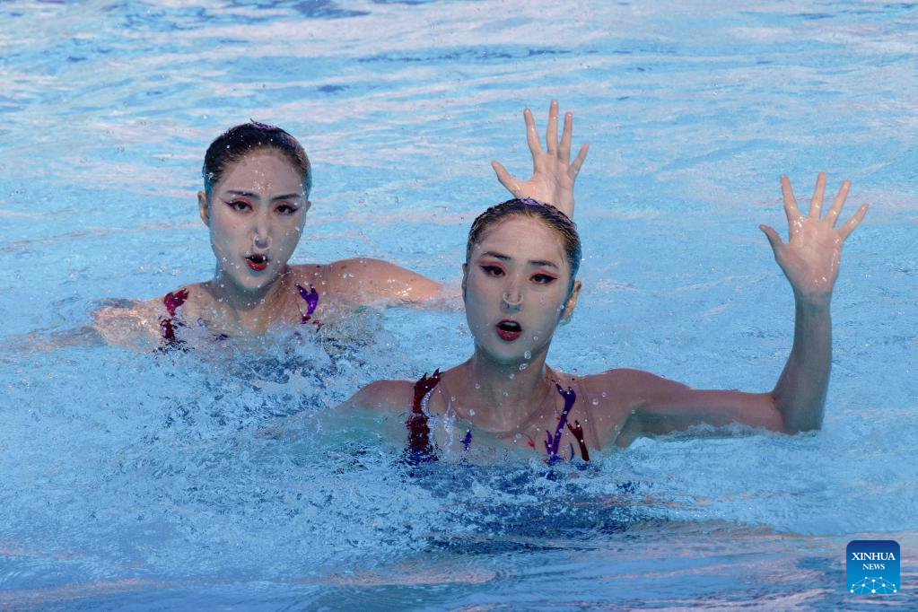 Wang Liuyi and Wang Qianyi of China perform during the Artistic Swimming Women Duet Technical Final at the 19th FINA World Championships in Budapest, Hungary on June 19, 2022. (Photo by Attila Volgyi/Xinhua)