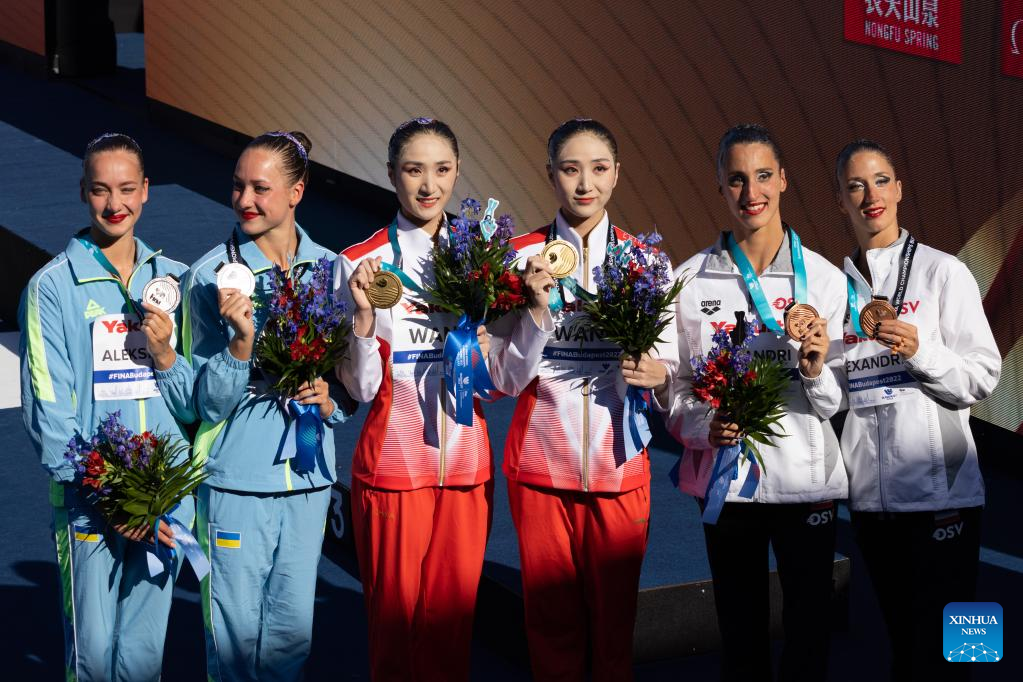 (220620) -- BUDAPEST, June 20, 2022 (Xinhua) -- Silver medalists Maryna Aleksiiva/Vladyslava Aleksiiva of Ukraine, gold medalists Wang Liuyi/Wang Qianyi of China and bronze medalists Anna-Maria Alexandri/Eirini Alexandri of Austria (from L to R) pose for photos during the awarding ceremony of the Artistic Swimming Women Duet Technical Final at the 19th FINA World Championships in Budapest, Hungary on June 19, 2022. (Photo by Attila Volgyi/Xinhua)