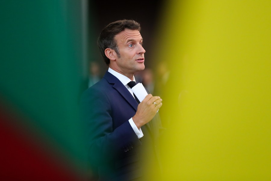 French President Emmanuel Macron speaks at the press conference after a special meeting of the European Council in Brussels, Belgium, May 31, 2022. (Xinhua/Zheng Huansong)