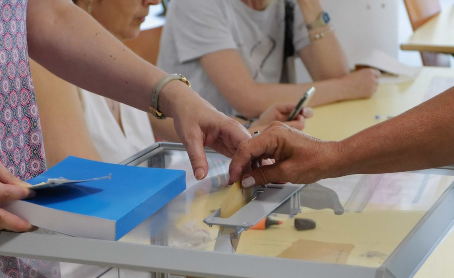 A resident casts her ballot at a polling station in Nice, southern France, June 19, 2022. (Photo by Serge Haouzi/Xinhua)